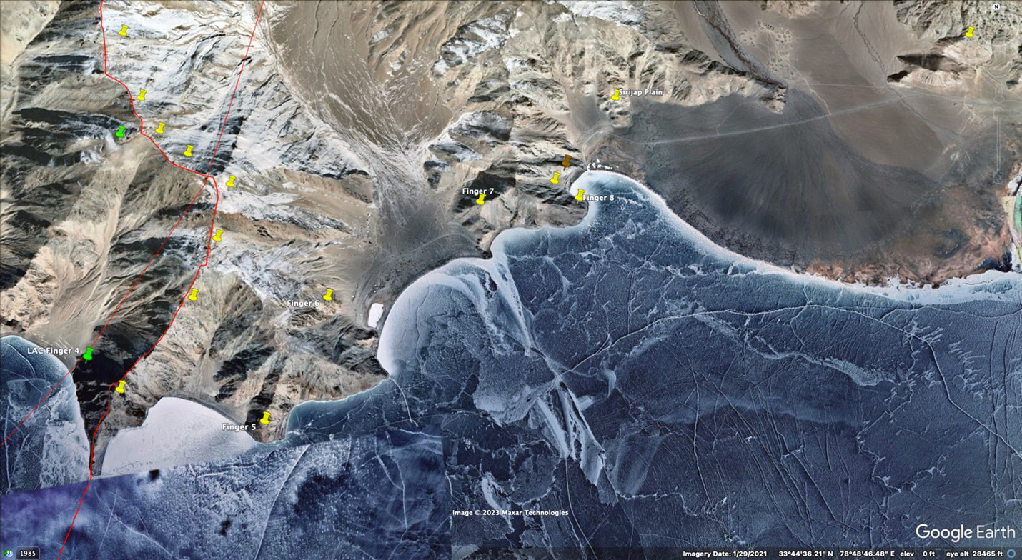 - The northern-most position on finger 4 is seen on Google Earth/Maxar Technologies image 1/29/2021, at 33 47 45N 78 45 46E. Return to text.