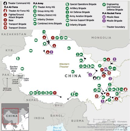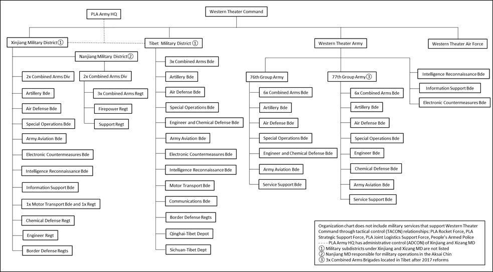 The People’s Liberation Army’s (PLA) Western Theater Command (TC) is responsible for defending nearly half of China’s landmass, yet only about one quarter of the PLA Army (PLAA) is deployed in the region. Two group armies are stationed in its eastern provinces, while the Xinjiang and Tibet Military Districts (MD) are assigned an assortment of units unlike those found in any other provincial military district.